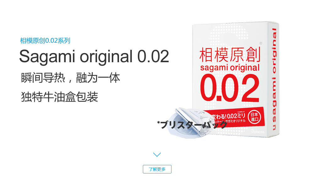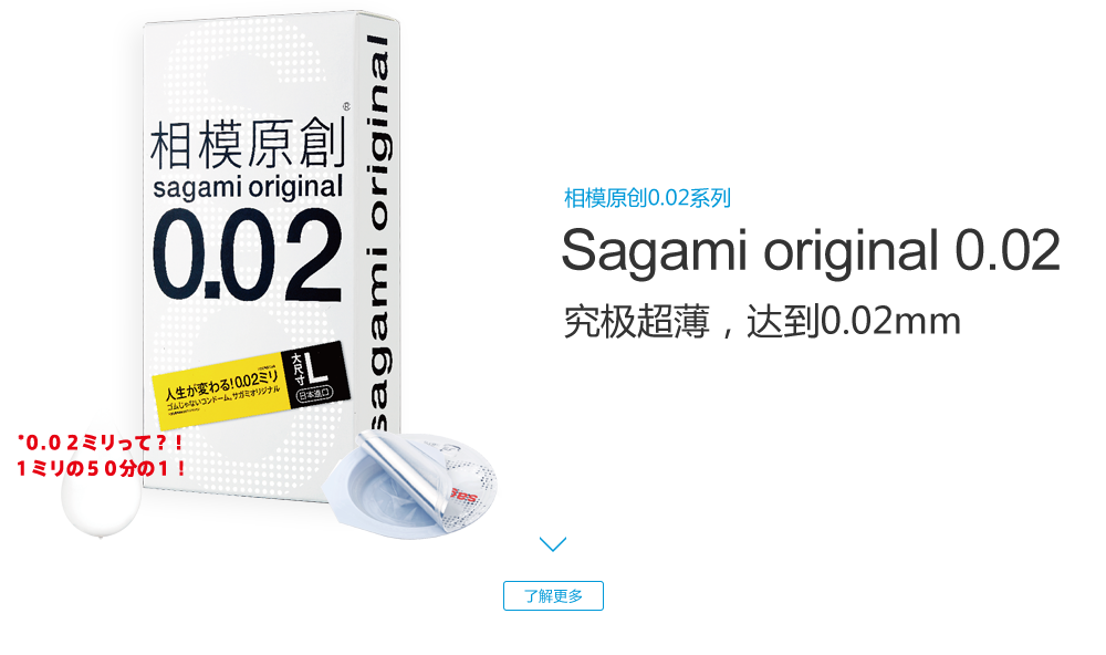 sagami original 0.02 (相模原創(chuàng)0.02系列), 是日本相模橡膠工業(yè)株式會社于1998年推出首次創(chuàng)新發(fā)明并向日本市場的一種以聚氨基甲酸酯 (高分子材料)為原料制成的非乳膠安全套, 厚度僅0.02mm, 是傳統(tǒng)的橡膠產(chǎn)品“厚度一半,強(qiáng)度三倍”, 并且擁有高導(dǎo)熱性能,讓產(chǎn)品使用體驗更加美妙!